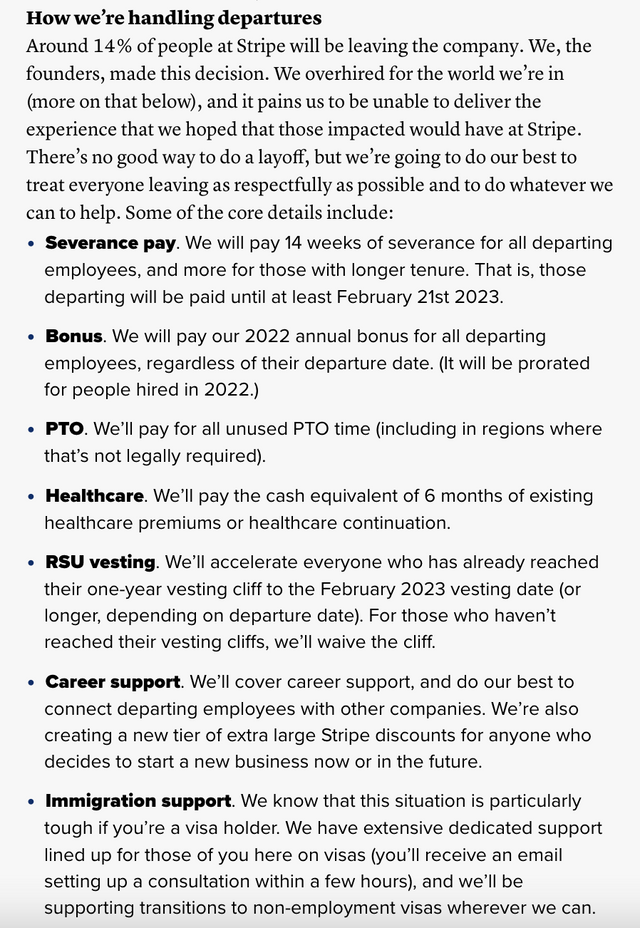 Stripe承诺将为所有离职员工支付 14 周的遣散费,为任期较长的员工支付更多。将为所有离职员工支付 2022 年年度奖金,无论其离职日期如何。将支付相当于 6 个月现有医疗保险费或医疗保健续费的现金。同时公司还将提供职业支持与移民支持。