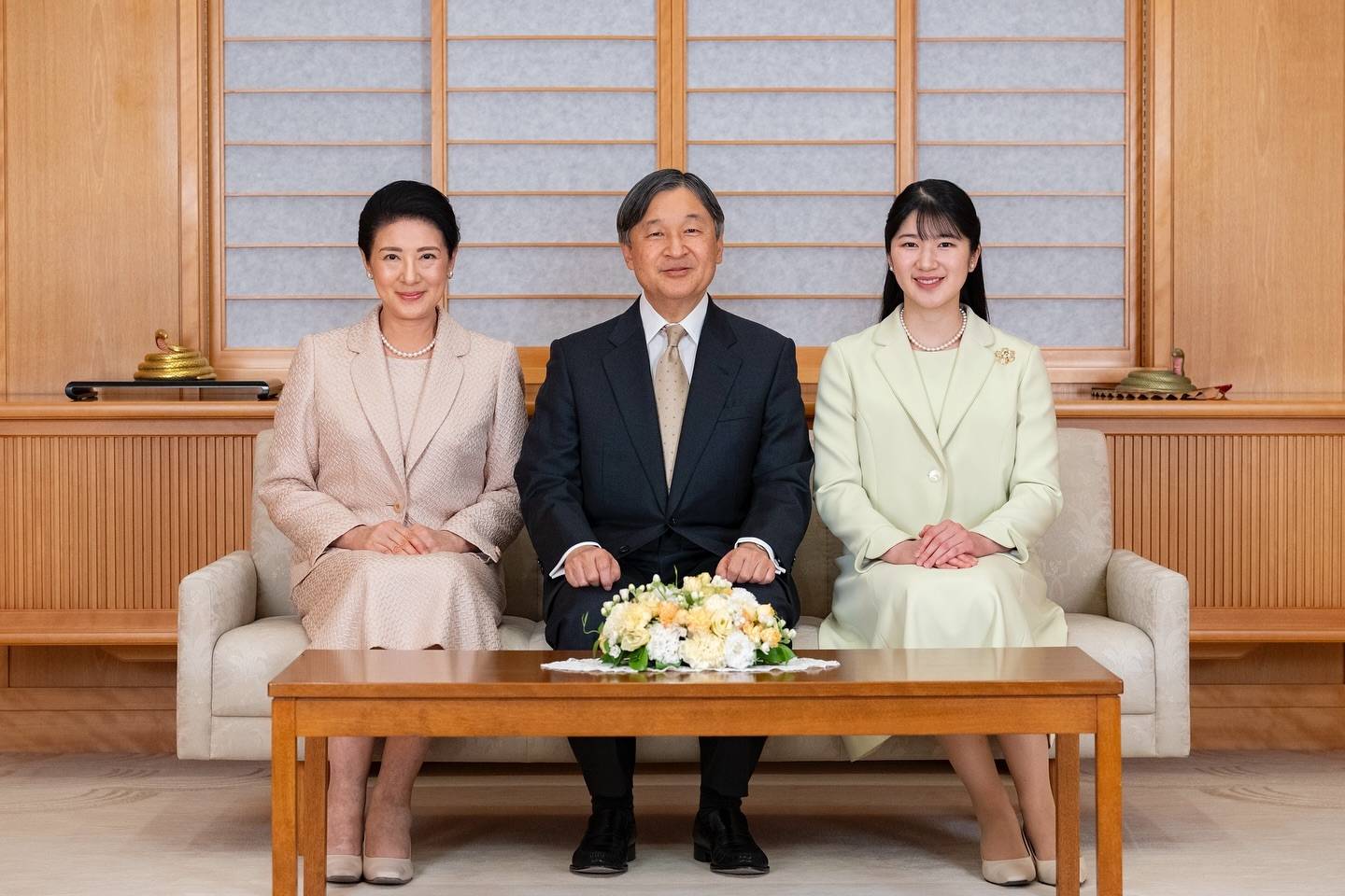 我们先来看看雅子皇后一家三口,爱子公主在全家福中倒是显得很瘦,这身米色的职业装配上半扎发造型,女神风范十足。