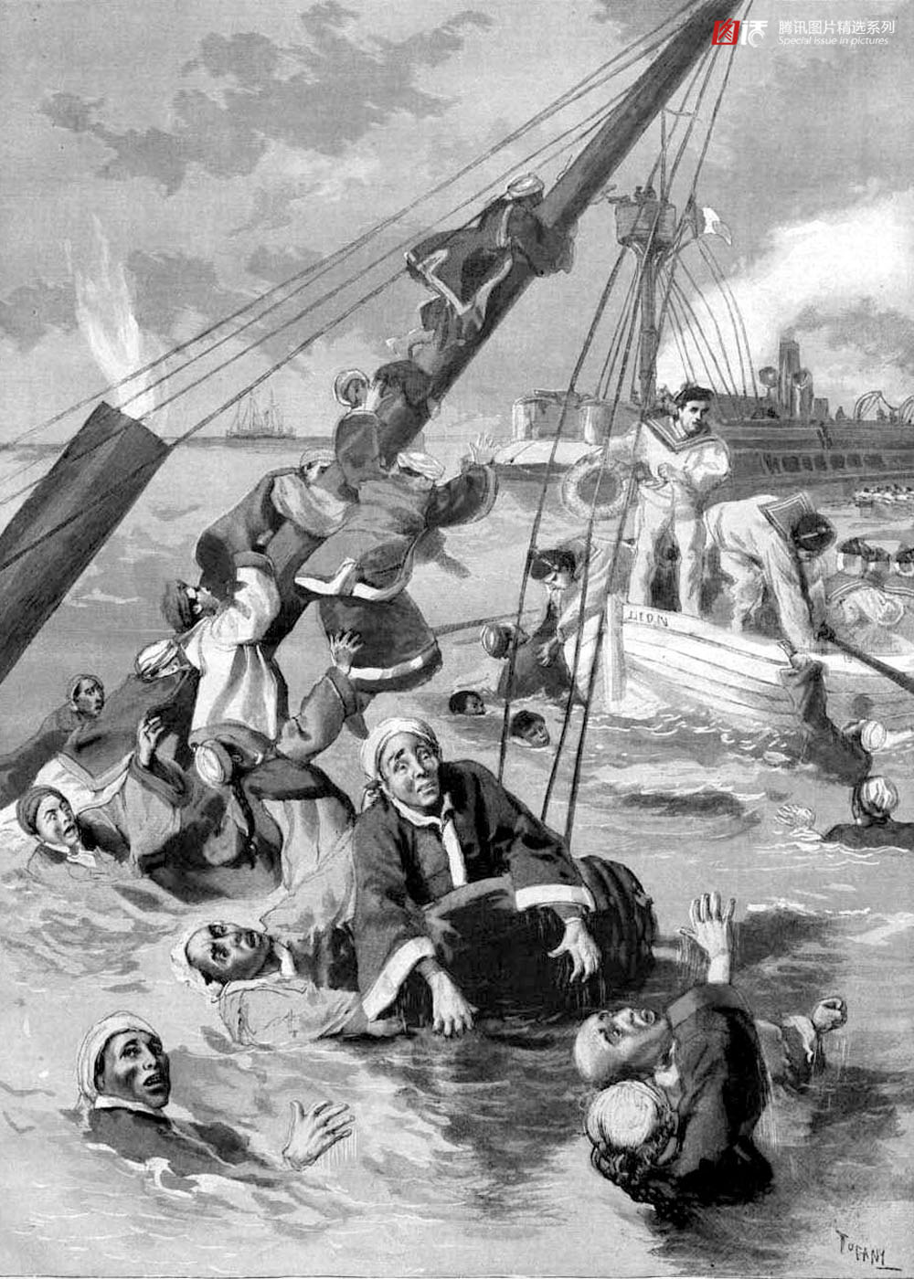 丰岛一战中,运载清军的英籍商船高升号被日舰击沉,舰上八百余名清军连带部分欧洲船员溺毙。英国法庭审判高升号一案时,日本利用暗中行贿等手段成功渲染其行动的合理性,最终日方被判无过错,此案至今仍是国际海事法经典判例。图为法国报纸版画描绘的高升号幸存清军。​
