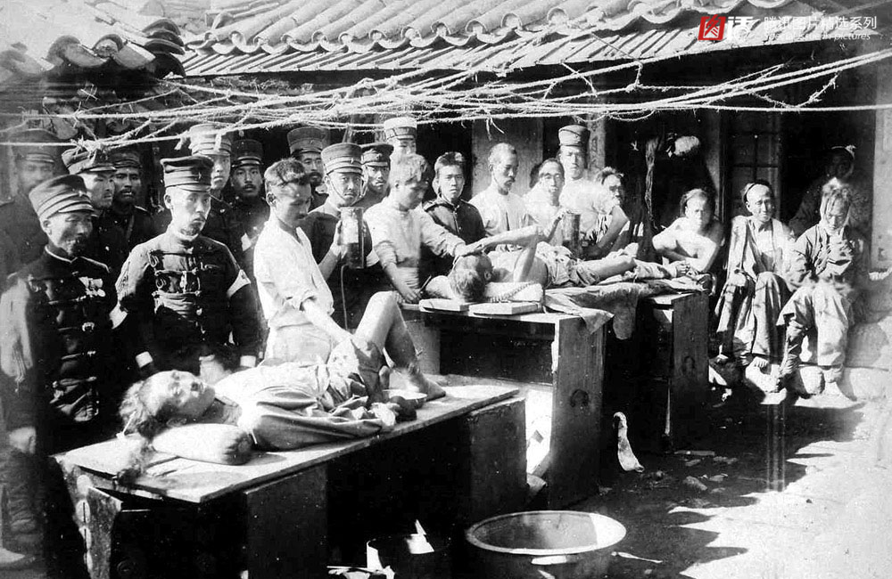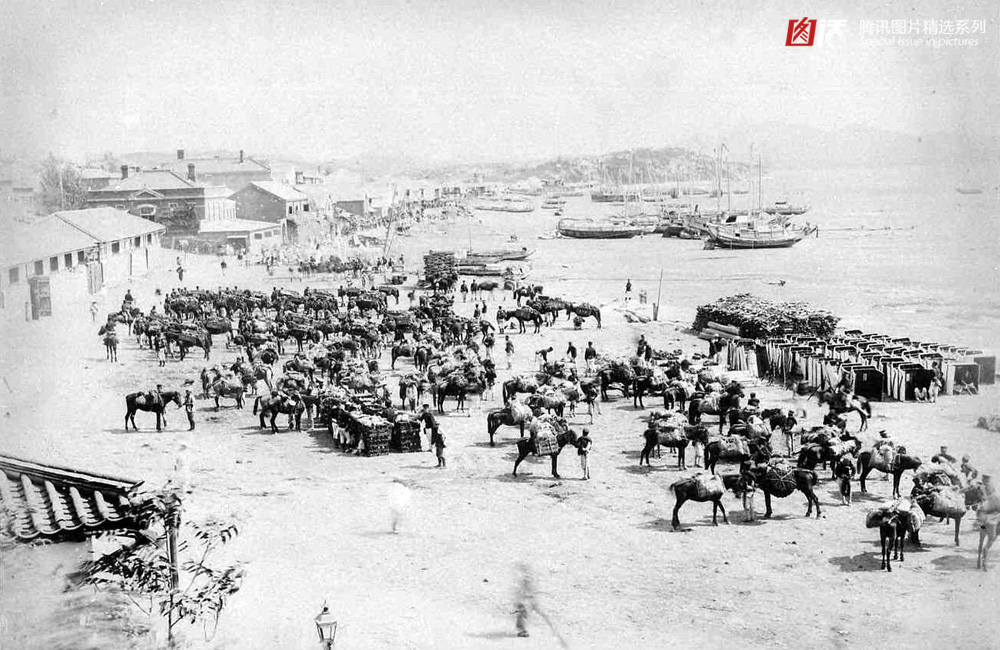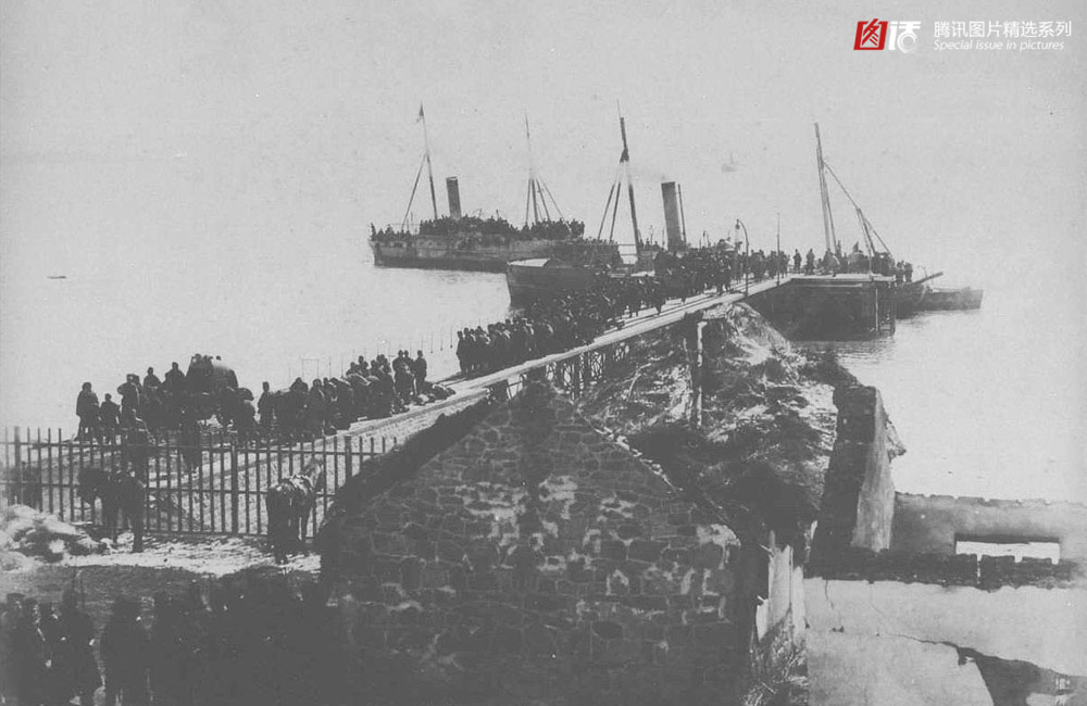 1895年1月,日军登陆山东荣成,围攻北洋水师最后的基地威海卫。2月17日,威海卫守军投降,日军在众多随军记者的见证下为清军俘虏治疗。图为威海卫清军降兵被日军运上岸等待遣散。​