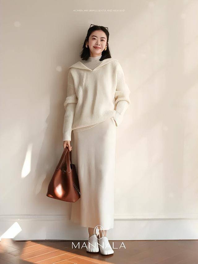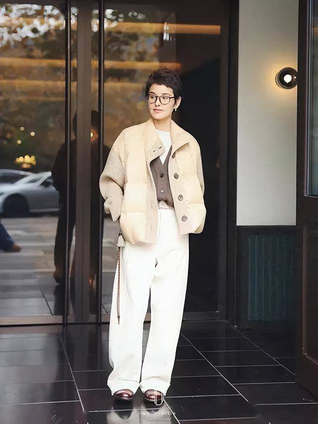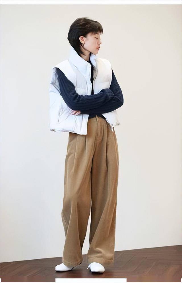 冬季玩转叠穿的时候,要学会避开臃肿感,羊绒材质的毛衣配羽绒马甲,显瘦效果立竿见影,搭配压褶设计的阔腿裤,踩双白色平底鞋,轻盈感十足。