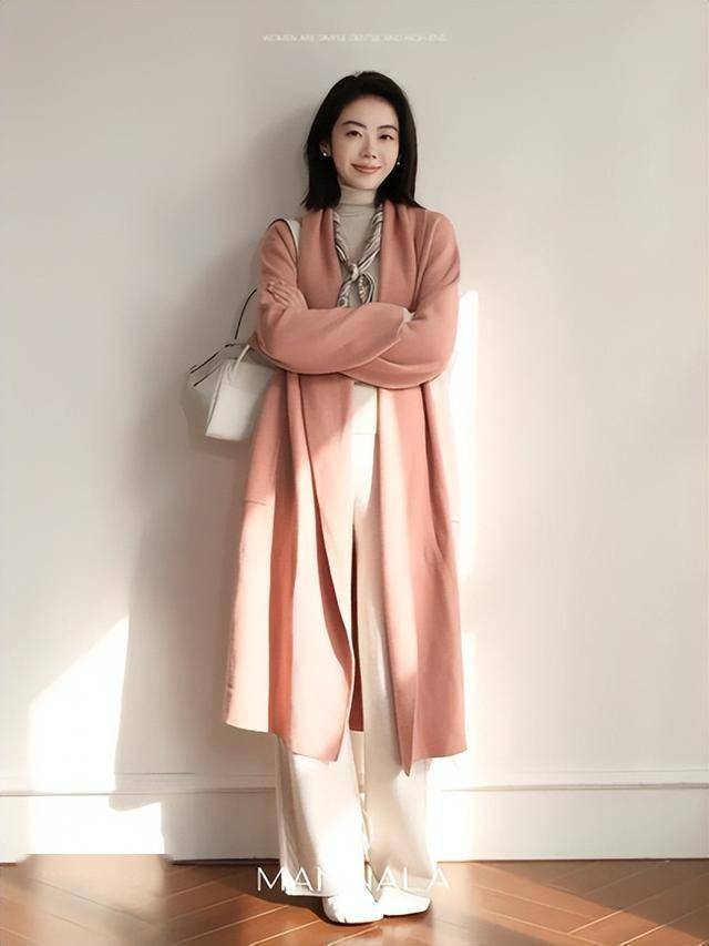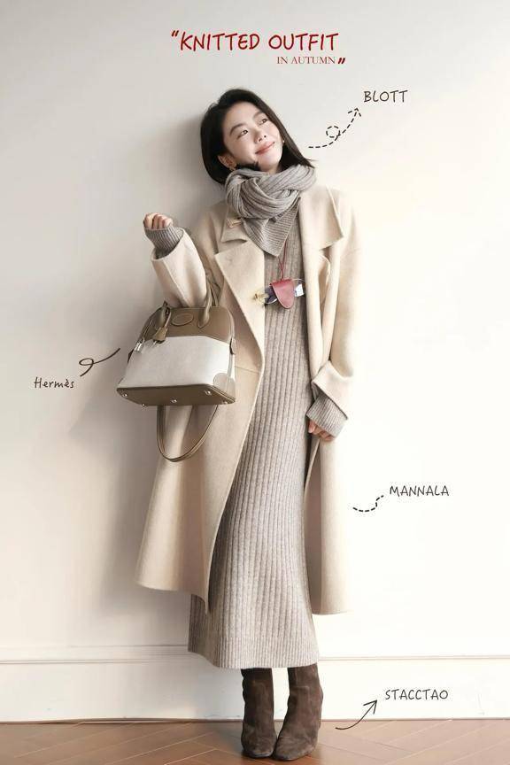 羊绒大衣垂感特别好,穿在身上具备显高的效果,尤其是过膝长度的款式,能够让人安全感爆棚,在里面叠穿一件针织连衣裙,系条围巾太温柔了。