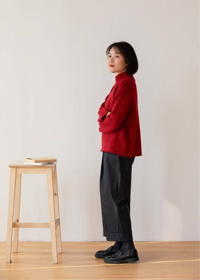 红色是衬肤显白的不二之选,用于羊绒材质的半高领毛衣当中,搭配黑色阔腿裤露出脚踝,再加上小皮鞋和短袜,瞬间拉长腿部比例。