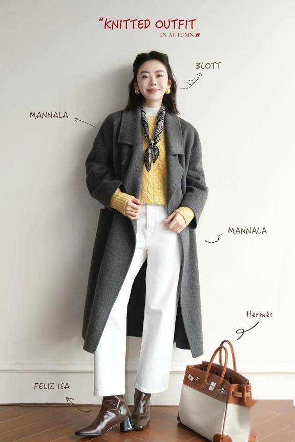 冬天别再穿羽绒服了,换上一件灰色的羊绒直筒大衣,叠穿鹅黄色针织毛衣,温暖中透露着一丝格调,再利用白色直筒裤进行过渡,别提多时尚了。