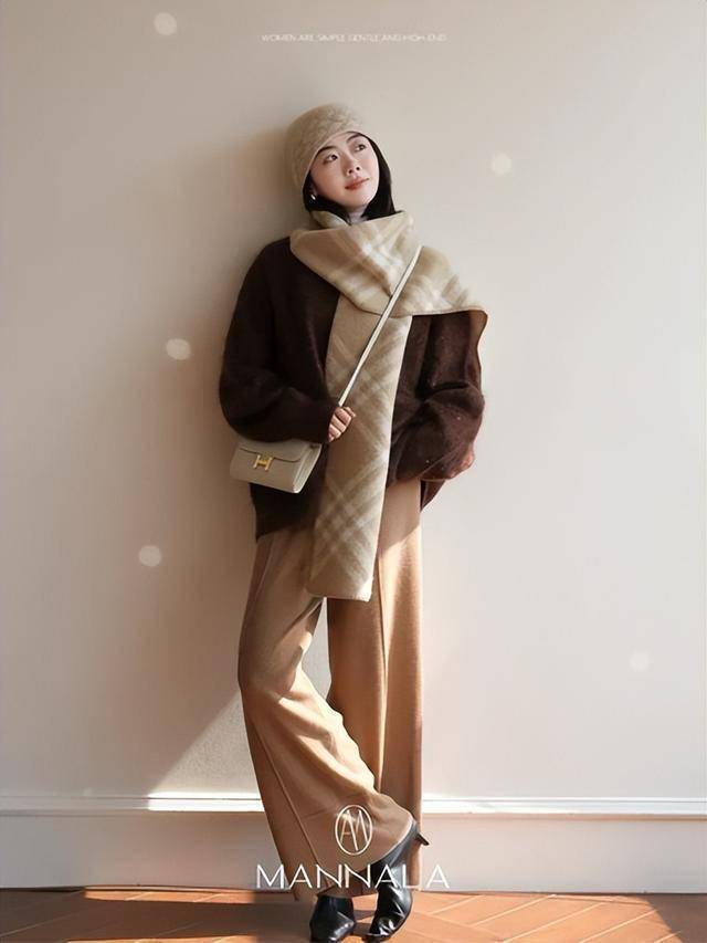 冬天怎么能错过同色系穿搭呢?选择一件咖色羊绒毛衣,搭配卡其色喇叭裤,“上深下浅”的组合,层次感十足,最后,还可以系上一条羊绒围巾,配同色帽子和包包更和谐。