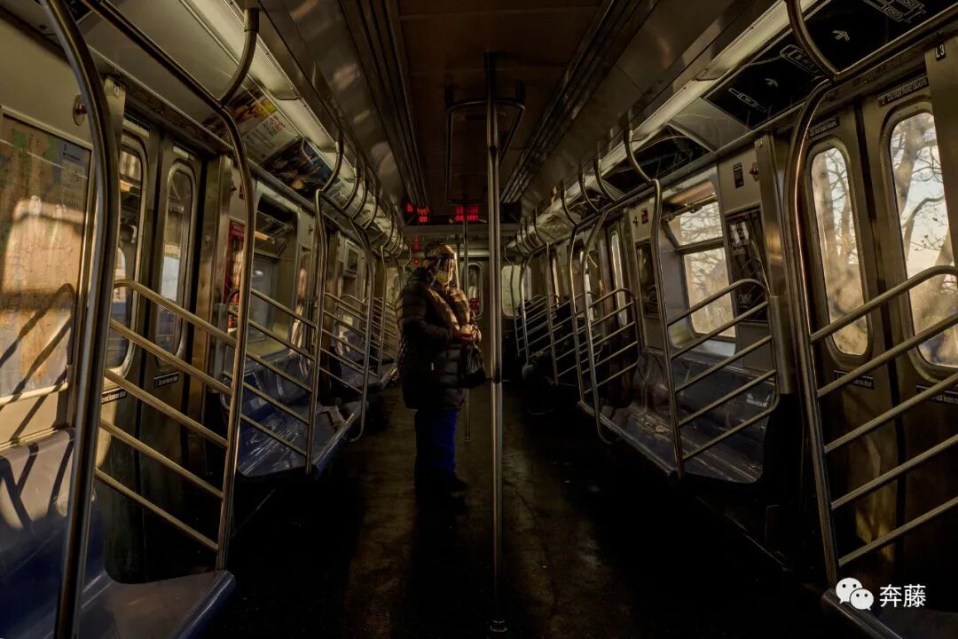 4月9日,纽约州皇后区,一名戴着防护口罩和面罩的妇女在Far Rockaway附近的一辆空旷的地铁上。
