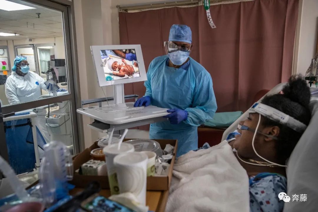 4月9日,纽约州布鲁克林市,Covid-19病人Precious Anderson在Erroll Byer Jr.博士和布鲁克林医院的帮助下通过视频见到了她的新生婴儿。