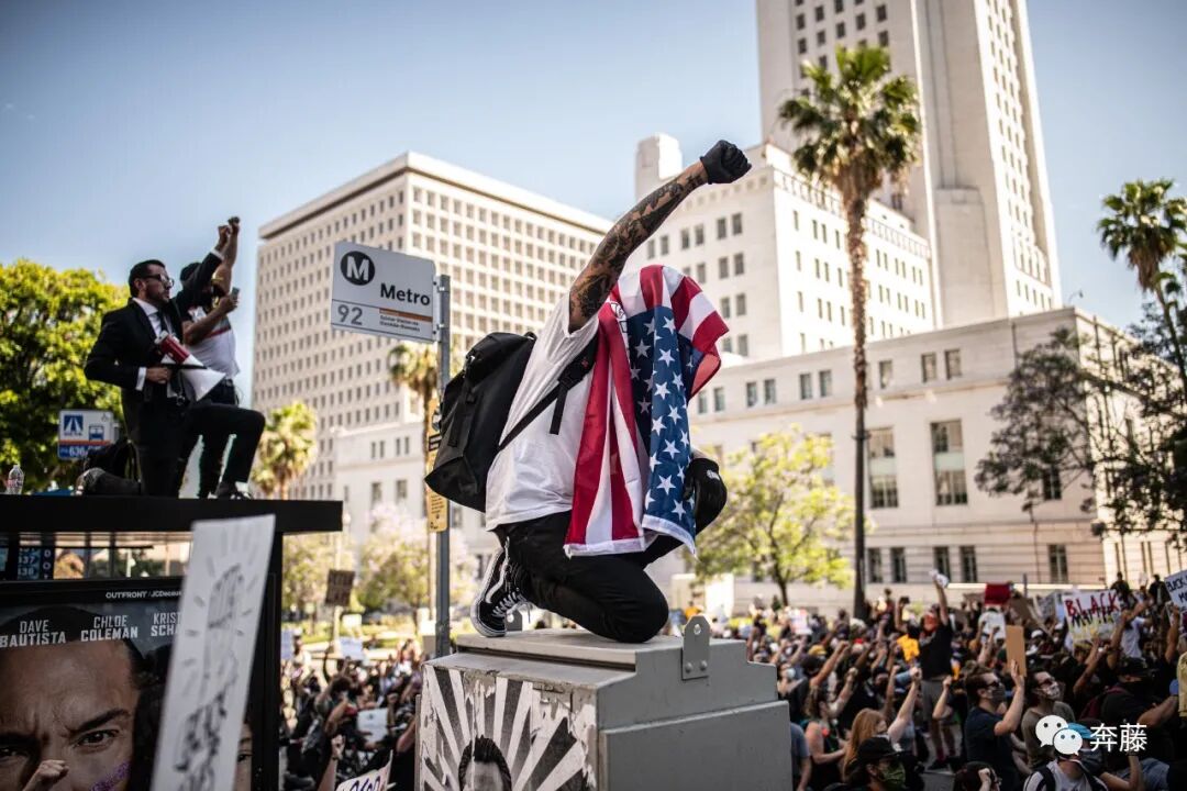 6月3日,洛杉矶,在司法厅前的沉寂片刻。宣布将乔治·弗洛伊德(George Floyd)按在地上致死的军官德里克·沙文(Derek Chauvin)将面临二级谋杀罪。