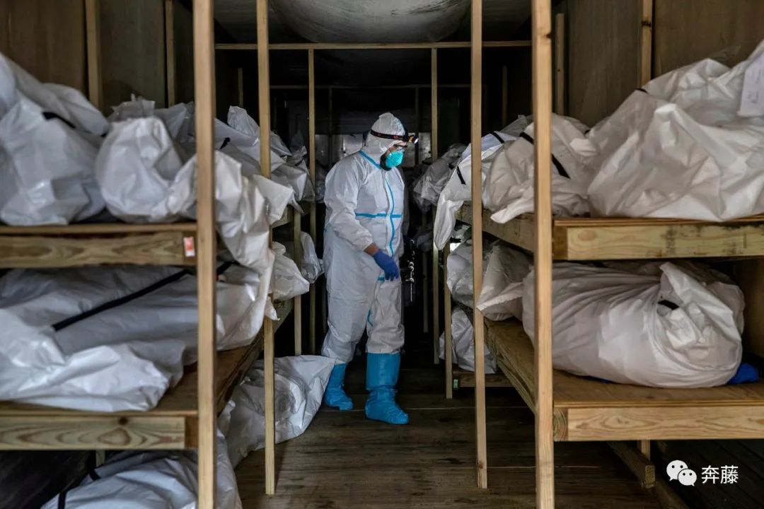 4月20日,纽约州布鲁克林,尸体被堆放在布鲁克林医院中心的冷藏拖车中。春季,冠状病毒感染激增,有2万多纽约人死亡。