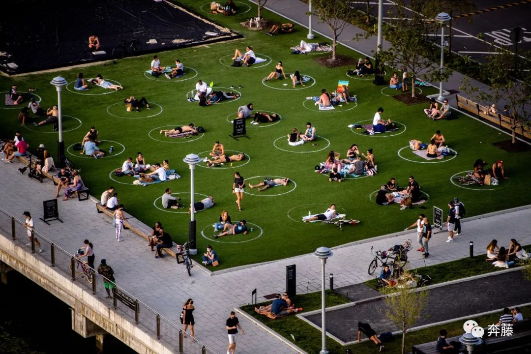 5月15日,纽约州布鲁克林市,威廉斯堡多米诺公园的草地上画上了的圆圈,帮助人们在户外度过时光的同时与他人保持社交距离。