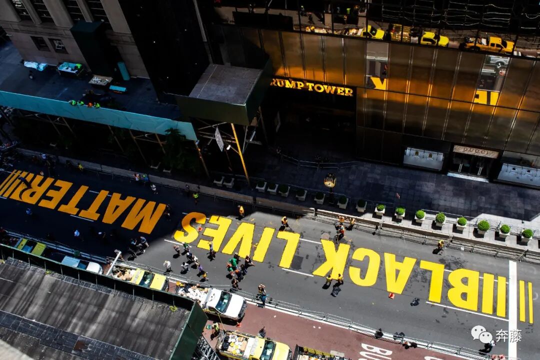 7月9日,纽约,特朗普大厦外的第五大道上绘制了大幅《Black Lives Matters》标语。这个标语引起了特朗普总统的煽动性回应。