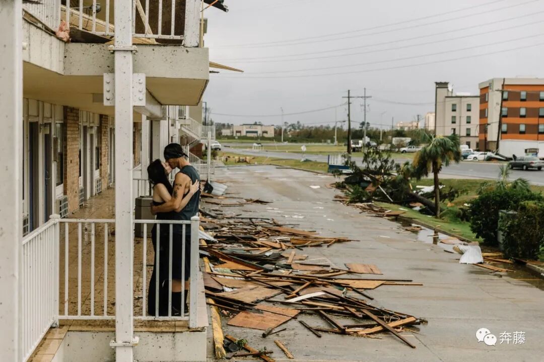 8月28日,路易斯安那州查尔斯湖,劳拉飓风猛袭路易斯安那州海岸之后。在一家汽车旅馆外面相拥的情侣。劳拉飓风每小时时速高达150英里,是美国大陆有史以来最强的风暴之一。