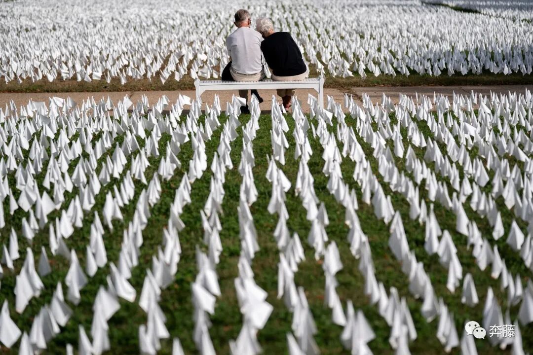 10月24日,华盛顿,艺术家苏珊·布伦南·福斯登伯格(Suzanne Brennan Firstenberg)在华盛顿特区军械库外插上了22万多面白旗,以纪念当时美国因冠状病毒死亡的人数。