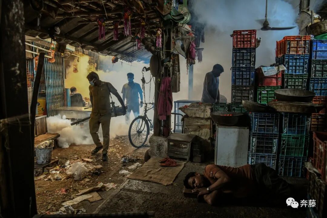 3月26日,印度孟买,一名市政工人正在熏蒸蔬菜市场。这是总理纳伦德拉·莫迪(Narendra Modi)宣布进行全国封锁以对抗冠状病毒爆发的第二天。