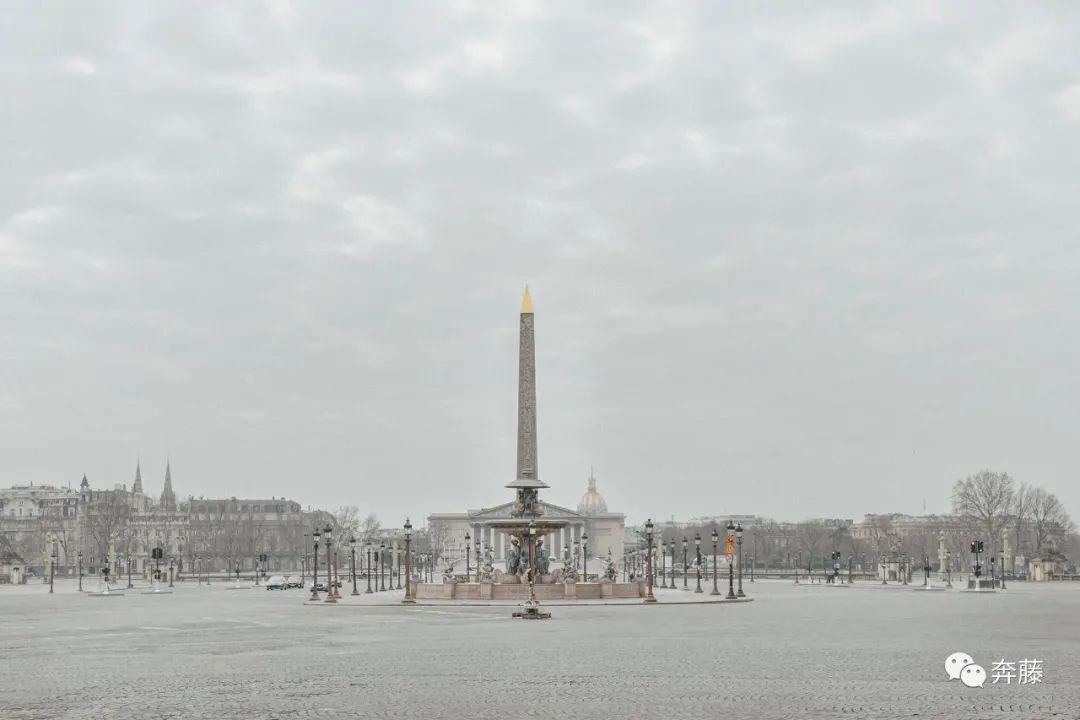 3月18日,法国进入封锁,巴黎协和广场Place de la Concorde在早上高峰时段空空如也。