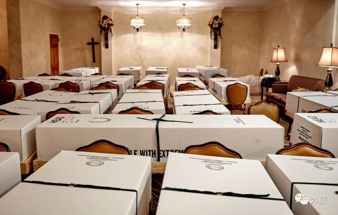 4月16日,纽约州皇后区,殡仪馆停放的棺材。当病毒肆虐纽约时,爆满的医院和墓地使殡仪馆的容量达到极限。