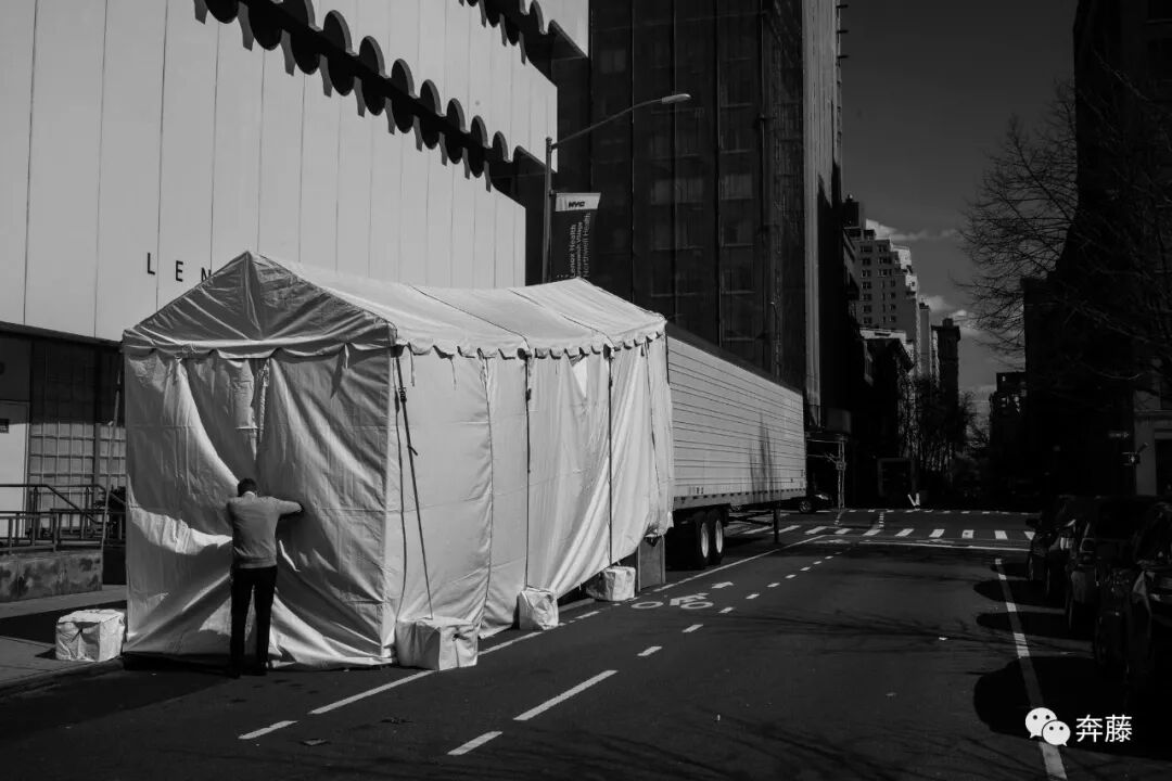 3月30日,纽约,一名医院工作人员正在检查一个与冷藏拖车相连的帐篷,该帐篷被用作莱诺克斯健康格林威治村外的太平间。冠状病毒危机将这座城市的照顾死者的系统推向了极限。