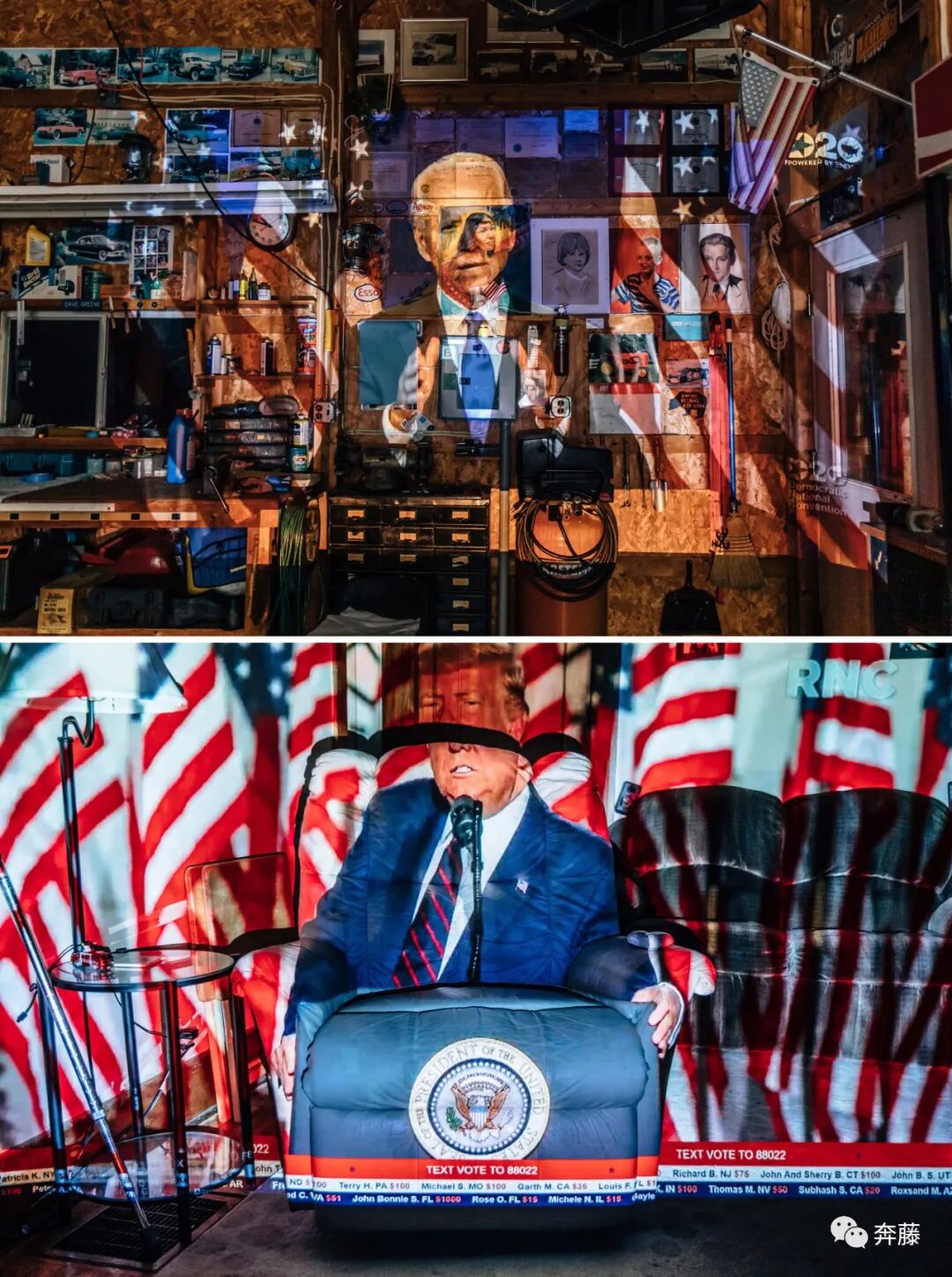 8月20日,纽约州科特兰;8月27日,纽约铁德奎特(Irondequoit),一道直播视频投射在墙上,显示前副总统约瑟夫·拜登(Joseph R. Biden Jr.)接受民主党总统提名。一台家庭影院放映机显示特朗普总统接受了共和党连任提名。
