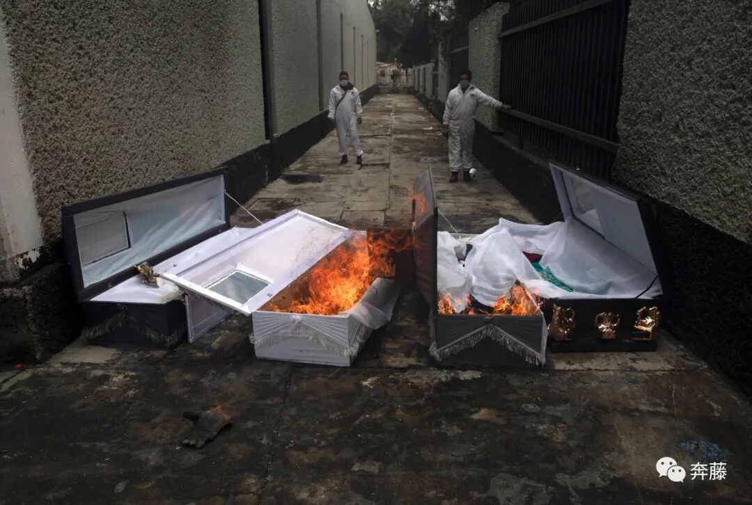 6月24日,墨西哥城,墨西哥尸体被火化后,工人们焚烧了Covid-19受害者的棺材。墨西哥是世界上冠状病毒死亡人数最高的国家之一。