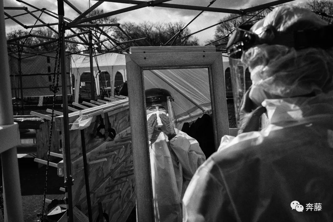 4月16日,纽约,I.C.U.护士克里斯蒂安·德克斯在中央公园的镜子中检查她的个人防护设备。纽约在中央公园建立了急救现场医院以帮助照顾病人。