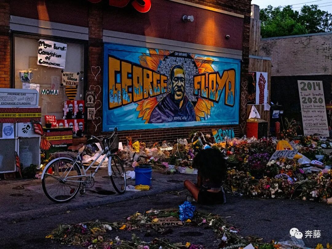 6月8日,明尼阿波利斯(Minneapolis),在乔治·弗洛伊德(George Floyd)被警官的膝盖按住致死的交叉路口,有人坐在鲜花,敬意和抗议标语中哀悼。