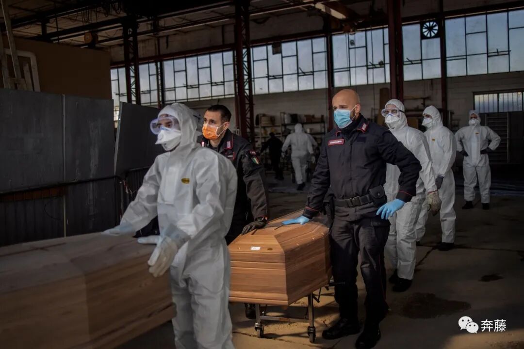 3月24日,意大利Ponte San Pietro,意大利陆军和宪兵将因冠状病毒而激增的死亡人棺材装上卡车,运出城市。
