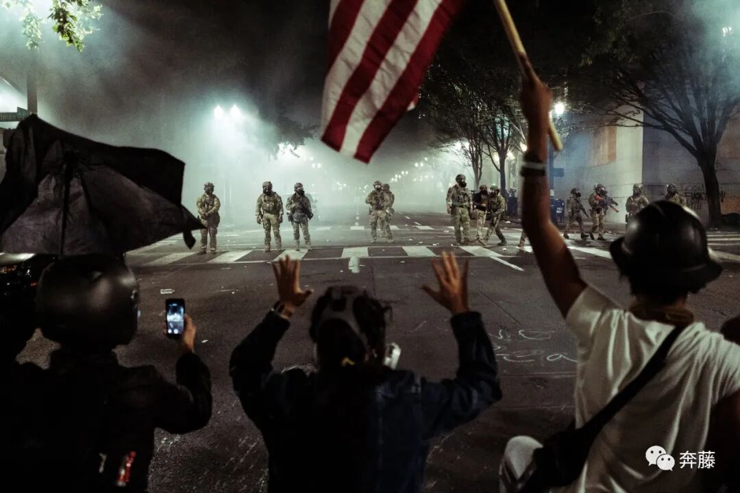 7月22日,俄勒冈州波特兰市,联邦特工在市中心联邦法院附近与抗议者发生冲突。特朗普政府派联邦特工前往波特兰和其他城市制止抗议活动。