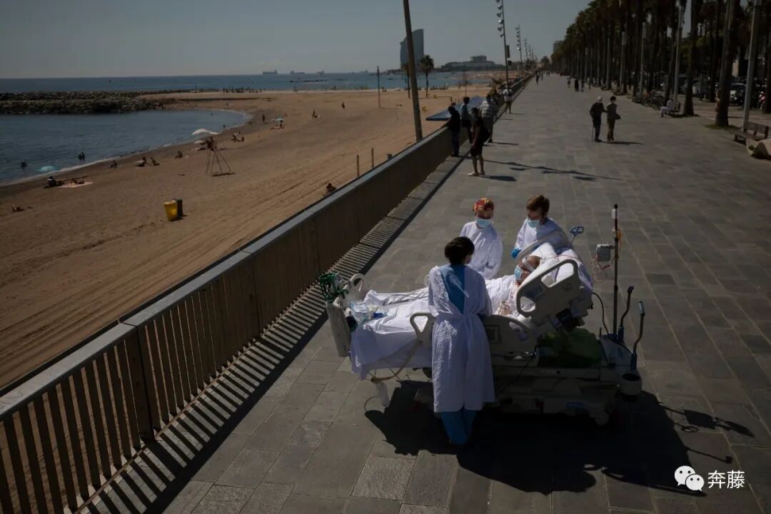 9月4日,巴塞罗那,60岁的弗朗西斯科·埃斯帕尼亚(FranciscoEspaña)是一名Covid-19病人,曾在重症监护室呆了几周,被医护人员带出医院面对平静大海,呼吸新鲜空气。