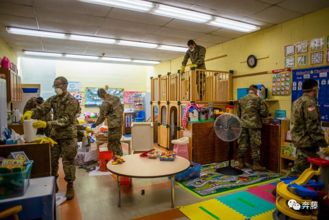 3月16日,纽约州斯卡斯代尔,国民警卫队成员在给中西部威彻斯特犹太社区中心JCC消毒。纽约在威彻斯特县创建了一个“收容区”,以遏制冠状病毒的传播。