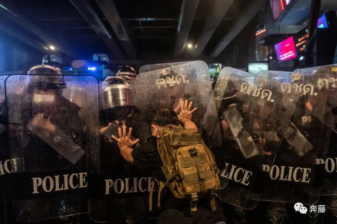10月16日,曼谷,一名反政府示威者与军官发生冲突,军官用高压水枪驱散人群,高压水枪喷洒了化学刺激物。和平抗议活动持续了数周,口号是“辞职,改写,改革”。