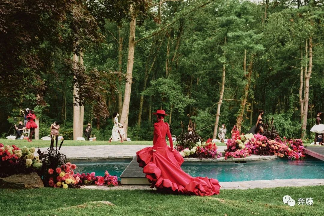 9月17日,康涅狄格州韦斯特波特,时装设计师克里斯蒂安·西里亚诺(Christian Siriano)在他位于康涅狄格州的家中展示了他的2021年春季系列,其中包括坐垫,弗拉明戈褶边和口罩。