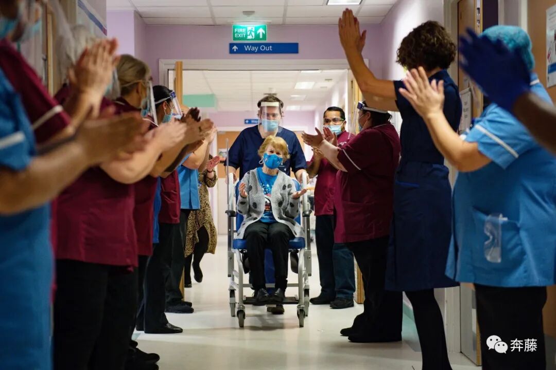 12月8日,英格兰考文垂,医务工作者为90岁的玛格丽特·基南(Margaret Keenan)欢呼,因为她成为英国第一位接受由辉瑞和BioNTech开发的冠状病毒疫苗的人。 她说:“我感到非常荣幸。”