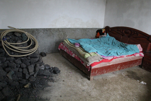 小俊家的卧室,虽然是新房,但家中穷苦,也无人照顾,只能将当地产的无烟煤堆放在地上。