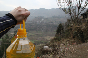 微公益小余自秀一下成绩,徒步四十分钟,背包、拎着油爬到了山腰的小宝家。