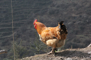 山中的公鸡都是被散养,享受着国王般的待遇,晒太阳,走山路,在草丛中寻找吃的。
