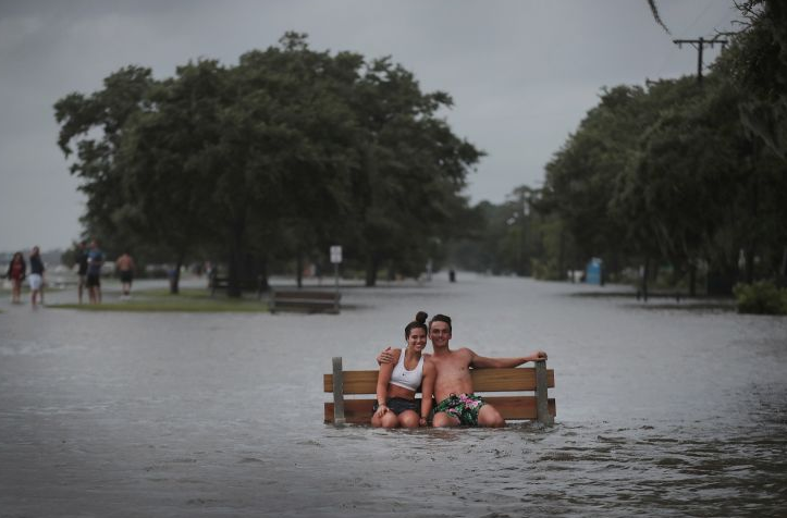 飓风带来暴雨,一对男女坐在公园长椅上(来源:Getty)