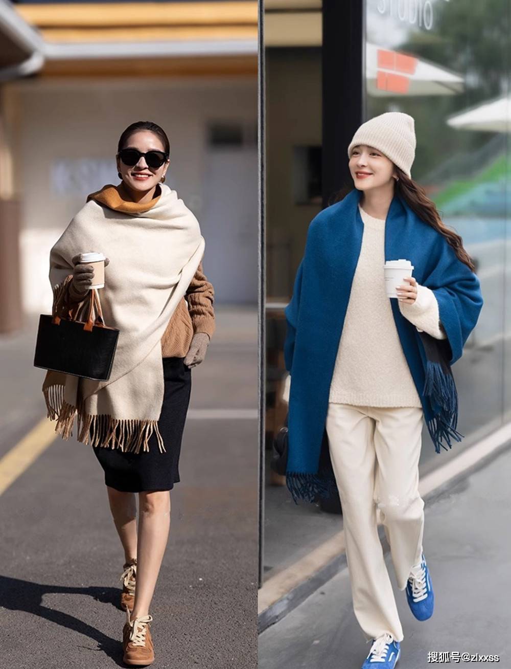深秋或是初冬的时候,我们可以用一条加厚羊绒围巾作披肩,直接披在羊毛衫的外面,再配双和围巾同色的平底鞋,能给我们提供足够的温暖,好看又时尚。