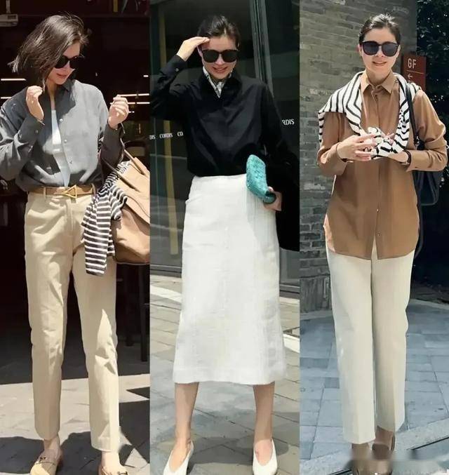 衬衫是40+职场女生的标配,几乎全年无休,可以单穿也可以打底,与平底的乐福鞋真的很配。 灰色衬衫叠穿白T,很帅气很清爽的感觉,搭配浅卡其色的烟管裤,更觉得利落清爽了,搭配了浅卡其色的乐福鞋,整套的搭配简约而不简单,彰显出职场女性的爽利感。