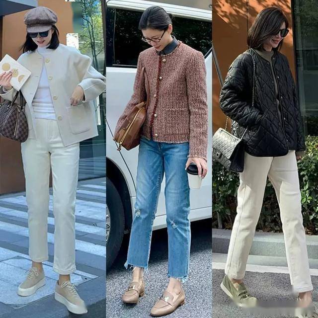 秋天很适合穿短款外套,既保暖又轻盈,可以搭配运动鞋或是帆布鞋子来穿,更活泼减龄。 白色的小香风外套带着优雅精致的女人味,搭配了白色的烟管裤,配上浅卡其色的帆布鞋,整套的搭配很有老钱风的味道,适合40+女生,穿起来很高级,又不会显得特别隆重,简单帅气。