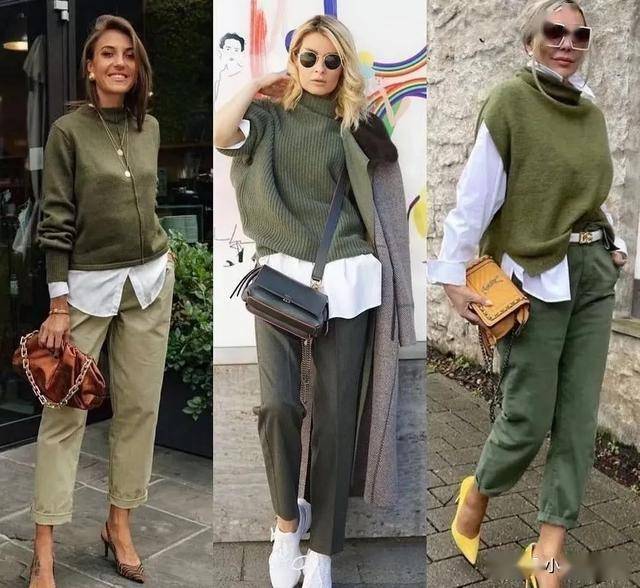 欧美风格中叠穿在秋季的出镜率非常高,将两件或是三件本来很普通的单品进行叠加,会出现N倍的时髦效果。 比如今年秋天特别流行的苔藓绿色毛衣,单穿就觉得很普通也有些沉闷了,这时候在里面叠穿白色的衬衫,一下子就有层次感,而且配色也更加清新了,又时髦又减龄。