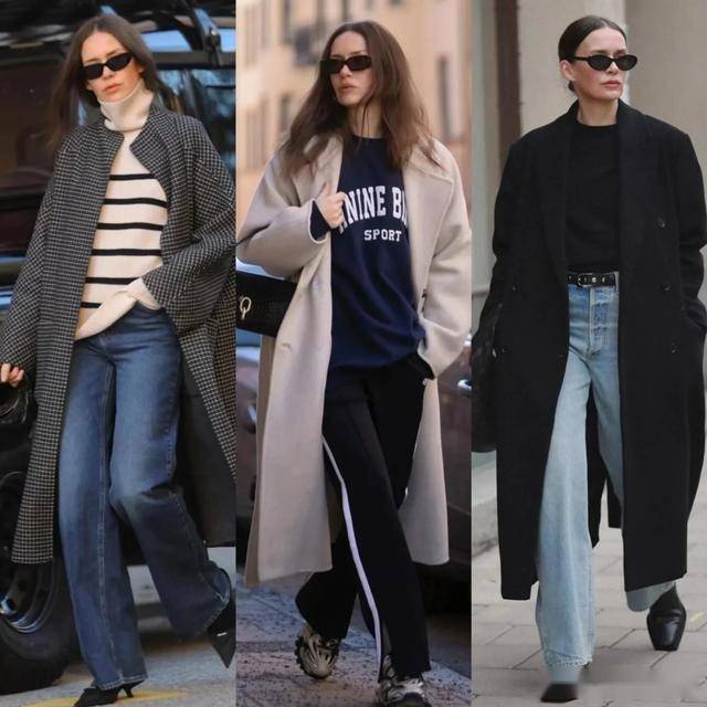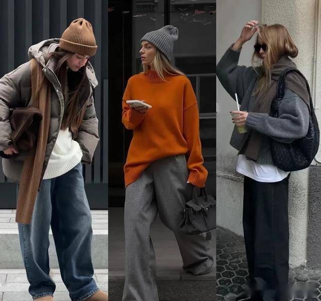 阔腿裤也是秋冬季欧美简约风很受欢迎的单品,它更修饰腿型,而且有走路带风的强大气场。 灰色的棉服,搭配了怀旧色的牛仔阔腿裤,风格是休闲慵懒的,很有松弛感,适合秋冬日常穿,又暖又大气。暖橘色的毛衣搭配了灰色阔腿裤,配色时尚温暖,同时又有着强大的气场感,很适合秋天的氛围。