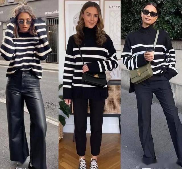 欧美简约风格穿搭一般不会出现太多复杂的设计,什么蕾丝花边、流苏、夸张的图案等,都是以经典的基础款为主,几乎没有任何的修饰,却可以轻松穿出大气高级的质感。 黑白条纹毛衣,秋季出镜率比较高的经典单品,不挑肤色,宽松一些更休闲了,可以搭配阔腿裤显得慵懒随性,也可以搭配鲨鱼裤去穿,更休闲运动一些。