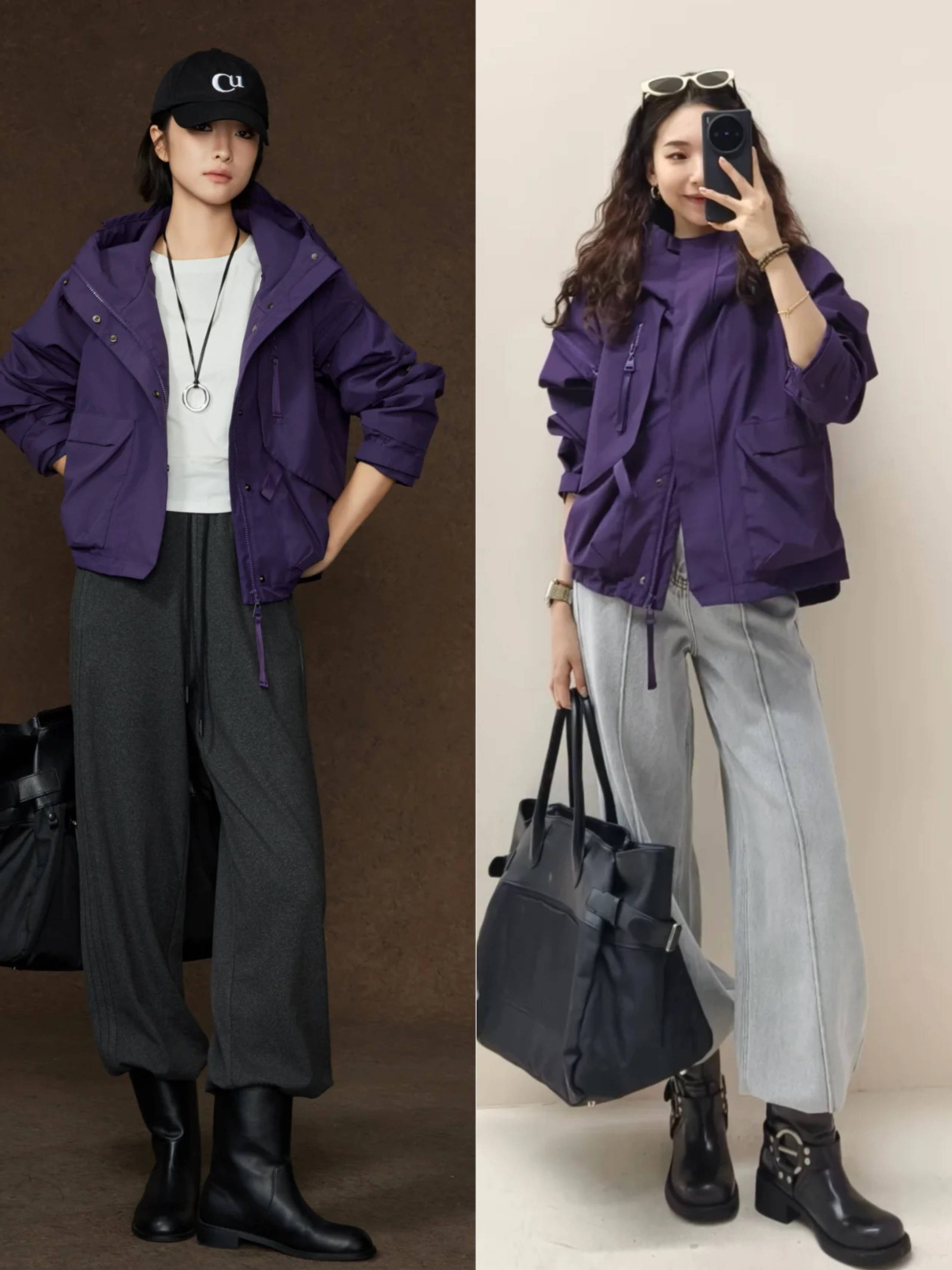 面料比较硬挺的冲锋衣,可以配高腰的毛呢裤来穿着。毛呢裤款式简洁,自带软糯防风效果。九分毛呢裤穿起来更利落,也很显气质。
