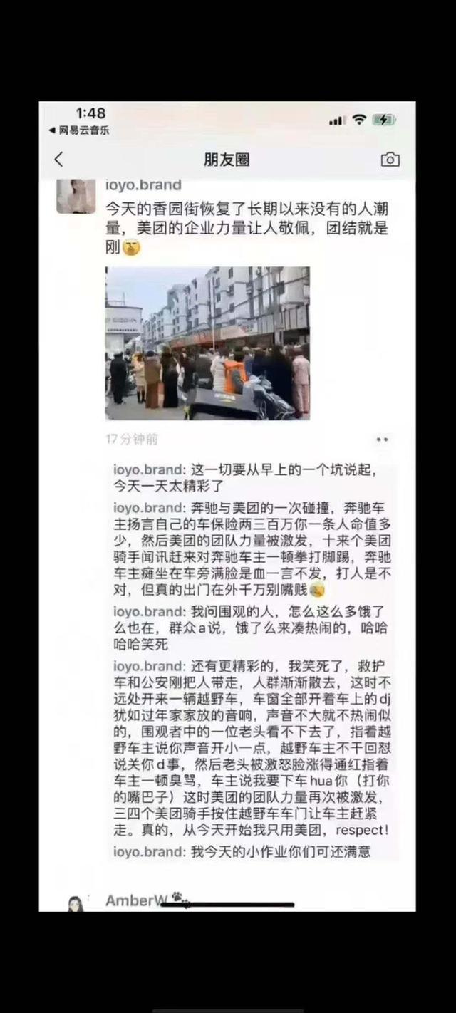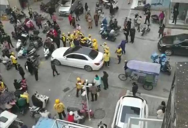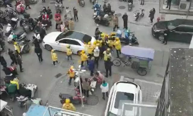 11月23日,江苏泰州香园街发生一起因行车纠纷引发的肢体冲突,一辆奔驰轿车与美团外卖小哥相撞,奔驰车主气焰嚣张,当场叫嚣自己的车险两三百万,外卖小哥的命值多少钱,自己赔得起,引起众多外卖小哥的愤怒,双方发生肢体冲突。\