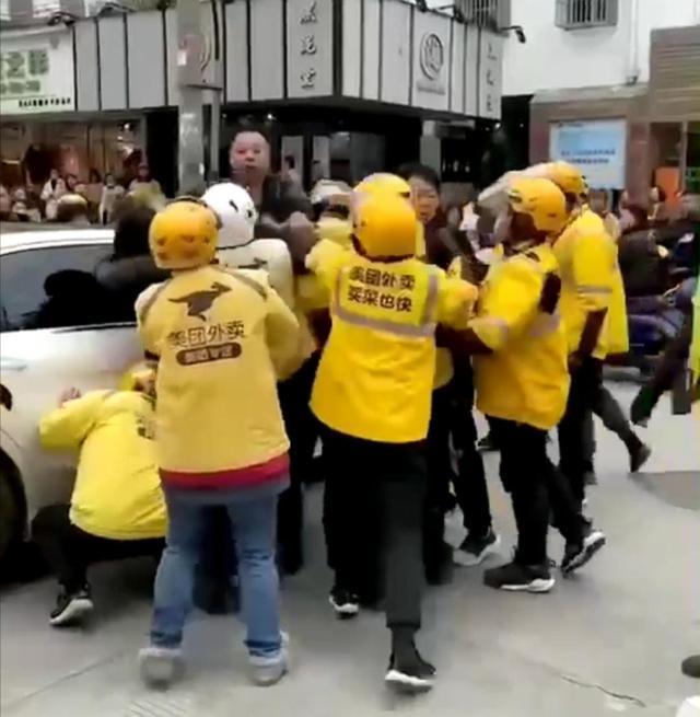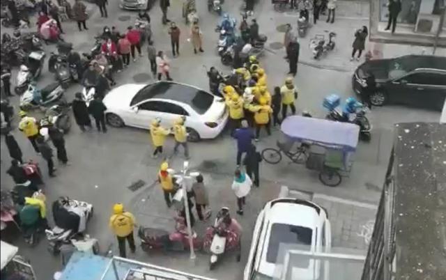 根据曝光的视频显示,十多名外卖小哥一哄而上,把奔驰车主围在奔驰车旁,好像在抢夺奔驰车主手里的什么东西,大家的情绪都很激动,好在很快有人将双方拉开,并没有发生更激烈的冲突。