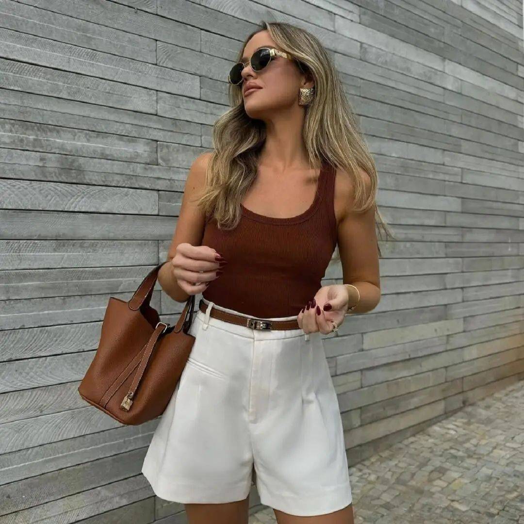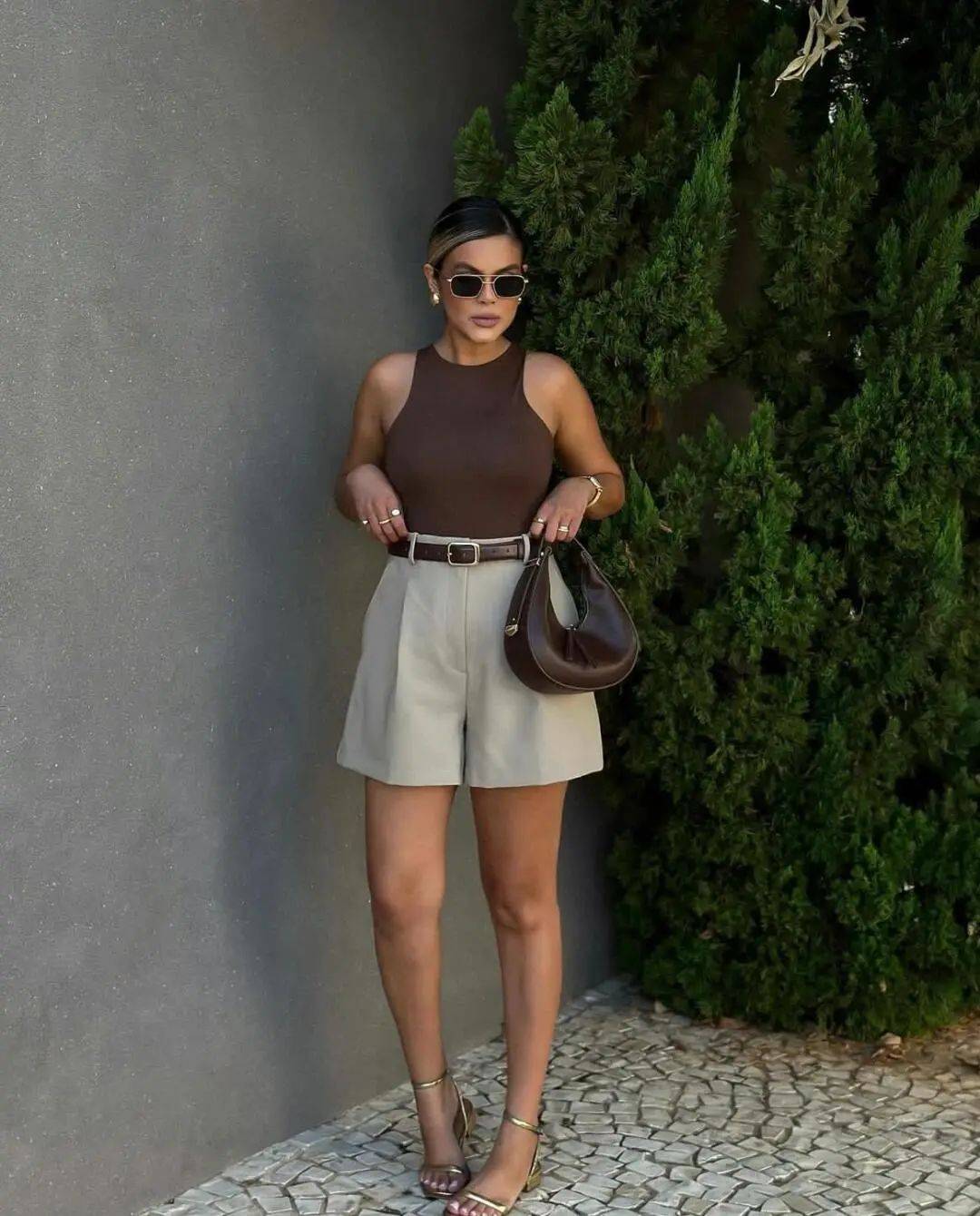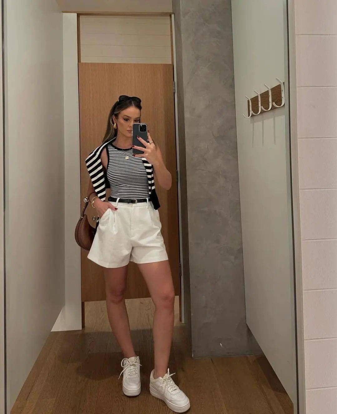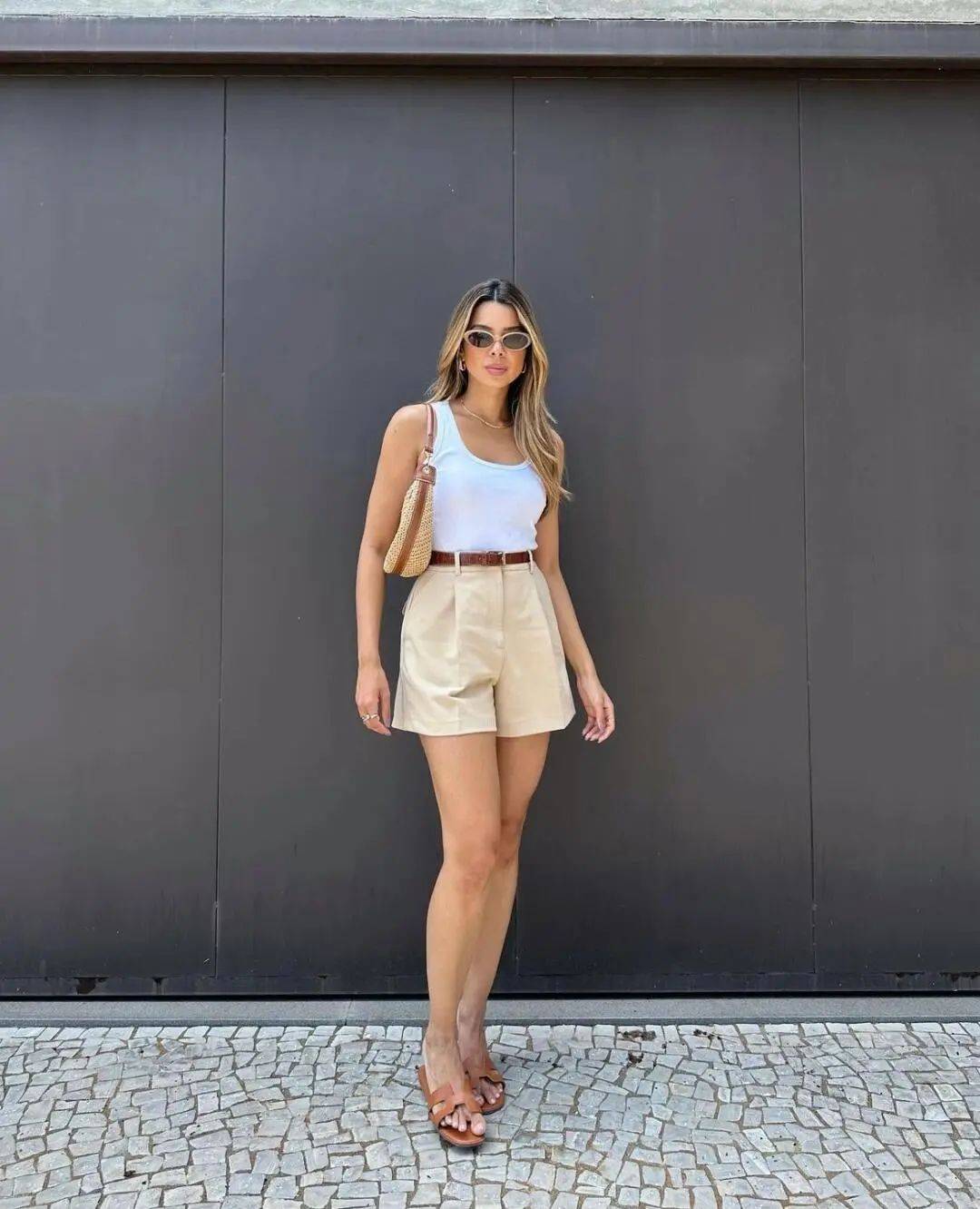 三伏天选择西装短裤没有任何弊端,在它的选款搭配上就能充分体现出这一优势。比如,大家可以像博主一样直接选择吊带儿背心与之搭配,干净利索的上紧下松穿衣方式,结合塞衣角穿法,不费力就能赚足回头率。