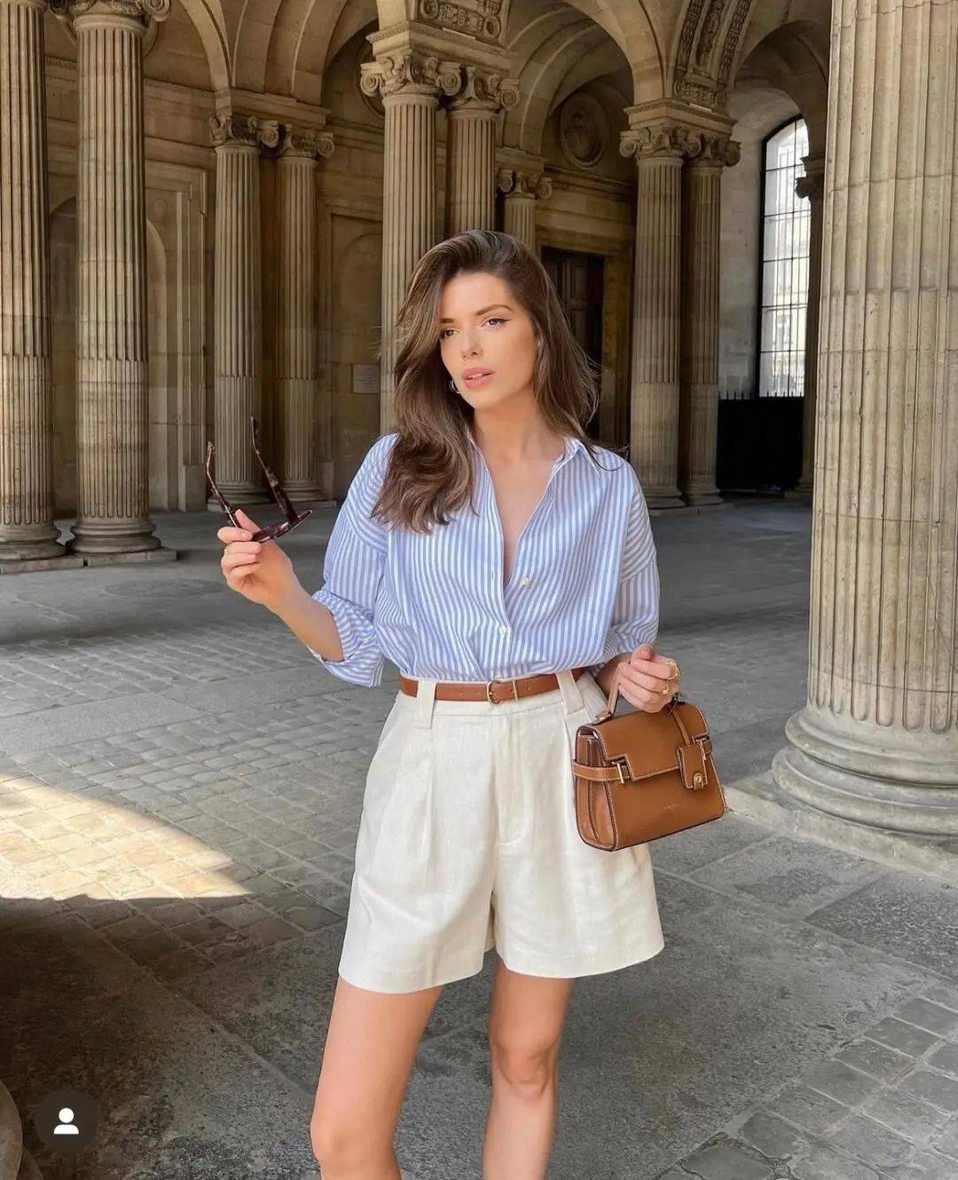 同样的,上班族学习借鉴也能去除“班味”,又美又飒,氛围爆表!为了突出身材比例的优势,大家可以像博主一样直接选择塞衣角穿法,但如果大家身材并没有优势,直接选择廓形衬衫与西装短裤搭配,也是OK的!