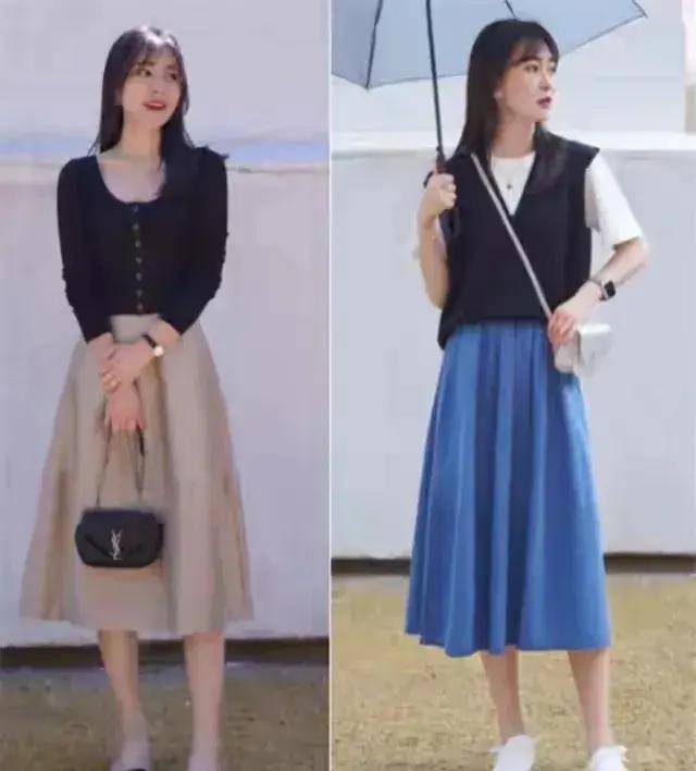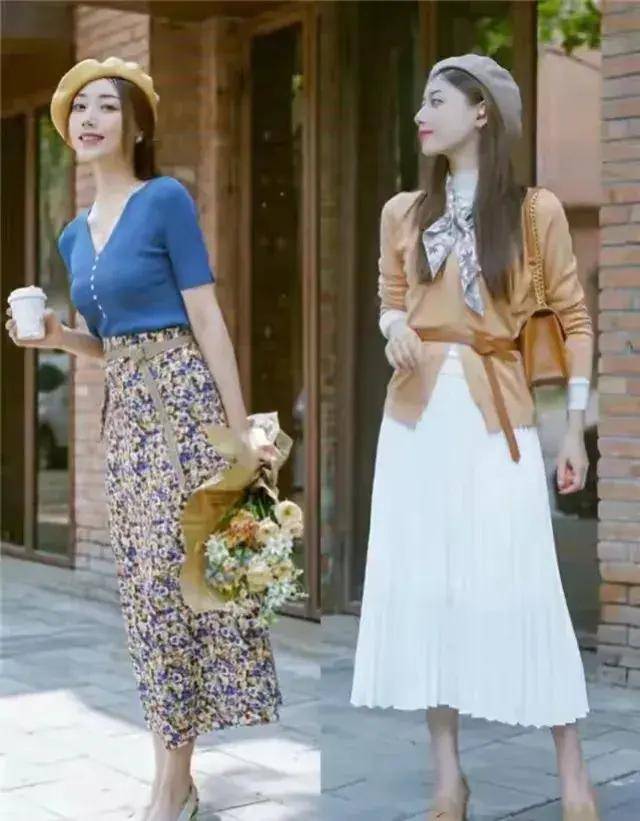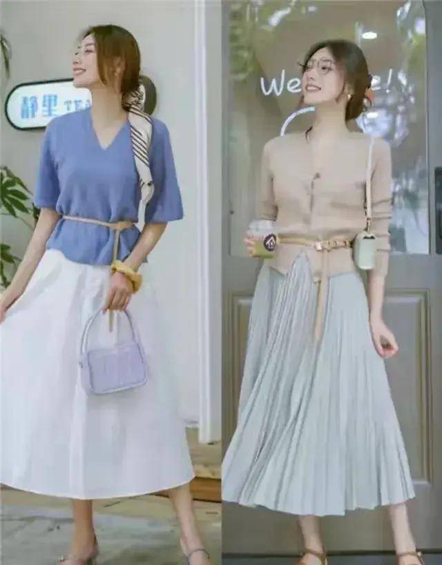 例如下面这位博主用V领的针织短袖搭配白色的散装半身裙,另一套是用杏色的针织衫搭配上百褶的半身裙,展现出女神范。