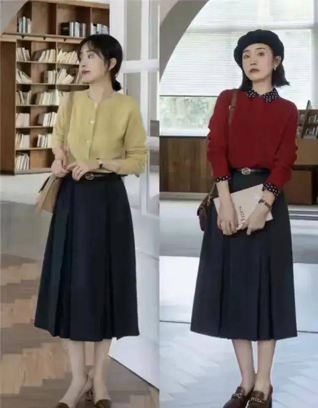 喜欢显白显嫩的,可以选择浅黄色的针织开衫,想要经典一点的风格,可以用深棕红色的针织上衣搭配上黑色或者是藏蓝色的伞状半身裙。