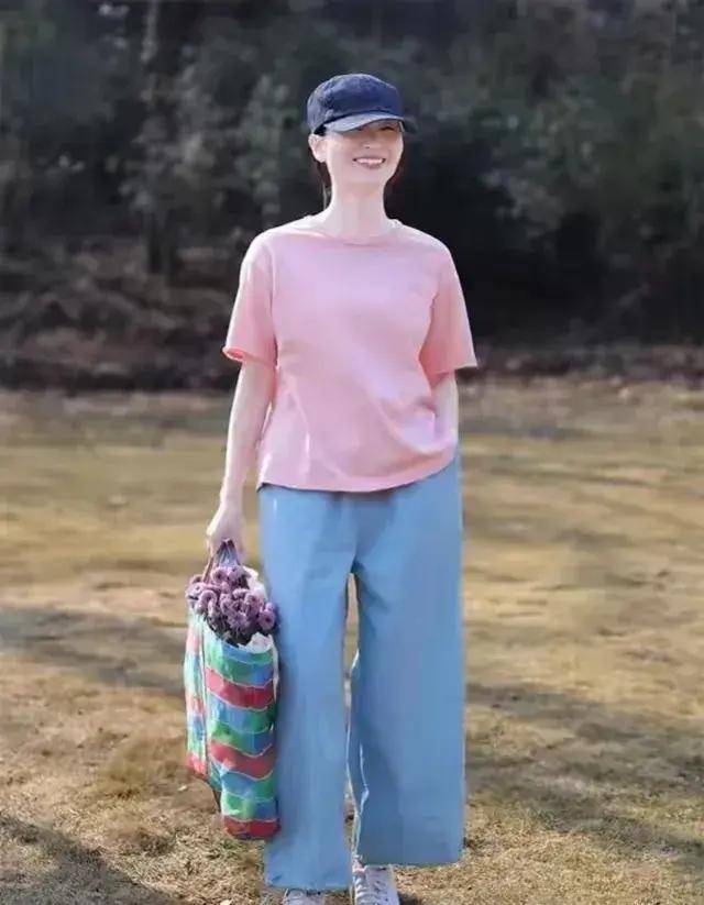 下面这一身穿衣造型其实非常适合中年女性,用粉色的短袖上衣属于宽松版,更遮肉,而且蓝色的阔腿裤和粉色短袖进行组合搭配,形成一个撞色效果,层次感分明。
